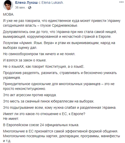 Но очень быстро принимают закон про Украинский язык. Который опять усилит раскол в обществе, которое и так , поделено на две части после выборов. Опять работать некогда, все в Фейсбуке, поливают друг друга помоями. Какая разница, на каком языке говорят люди, если они миллионами уезжают из страны???