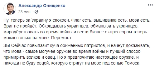 Экс-нардеп Александр Онищенко иронизирует: "Ну, теперь за Украину я спокоен. Флаг есть, вышиванка есть, мова есть. Враг не пройдёт. Обкрадывать украинцев, обманывать украинцев, мародёрствовать во время войны и вести бизнес с агрессором теперь можно только на мове. Перемога.