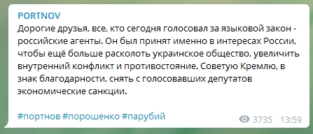 Политик Андрей Портнов: "Дорогие друзья, все, кто сегодня голосовал за языковой закон - российские агенты. Он был принят именно в интересах России, чтобы ещё больше расколоть украинское общество, увеличить внутренний конфликт и противостояние. Советую Кремлю, в знак благодарности, снять с голосовавших депутатов экономические санкции".
