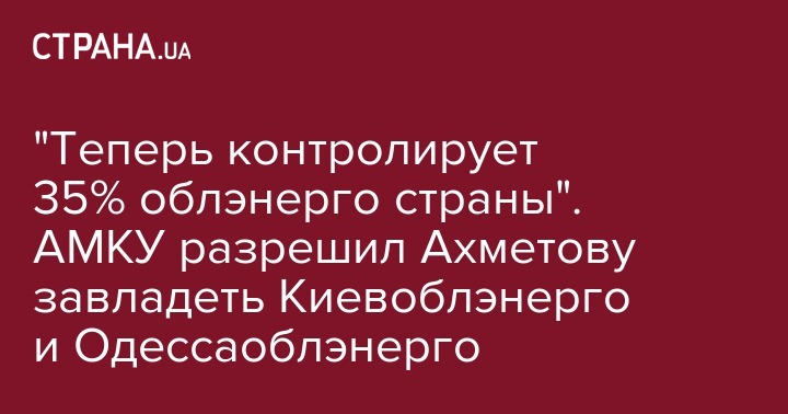 Антимонопольный комитет Украины 25 апреля большинством голосов разрешил Ринату Ахметову завладеть Киевоблэнерго и Одессаоблэнерго. Об этом сообщил член Общественного совета при Антикоррупционном бюро Украины Виталий Шабунин на своей странице в Facebook.