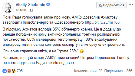 "В итоге Ахметов владеет 35% облэнерго страны. Это в дополнение к ранее согласованным ему антимонопольным: трети распределительных мощностей, 80% маневровой теплогенерации, 80% добычи электроугля, полному контролю экспорта и импорта электроэнергии. Вот она настоящая элита, а не "группа 25%"", - написал Шабунин.