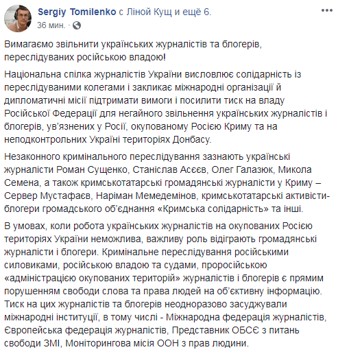 "Незаконное уголовное преследование испытывают украинские журналисты Роман Сущенко, Станислав Асеев, Олег Галазюк, Николай Семена, а также крымскотатарские гражданские журналисты в Крыму - Сервер Мустафаев, Нариман Мемедеминов, крымскотатарские активисты-блогеры общественного объединения "Крымская солидарность" и другие", - отметили в Национальном союзе журналистов Украины.
