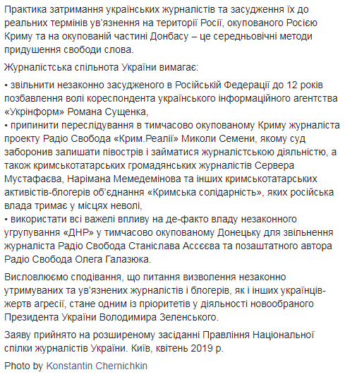 В НСЖУ также заявили, что уголовное преследование российскими силовиками, российскими властями и судами журналистов и блогеров является прямым нарушением свободы слова и права людей на объективную информацию и "средневековьем". Заявление было принято на расширенном заседании Правления Национального союза журналистов Украины. В частности, представители Национального союза журналистов Украины потребовали: