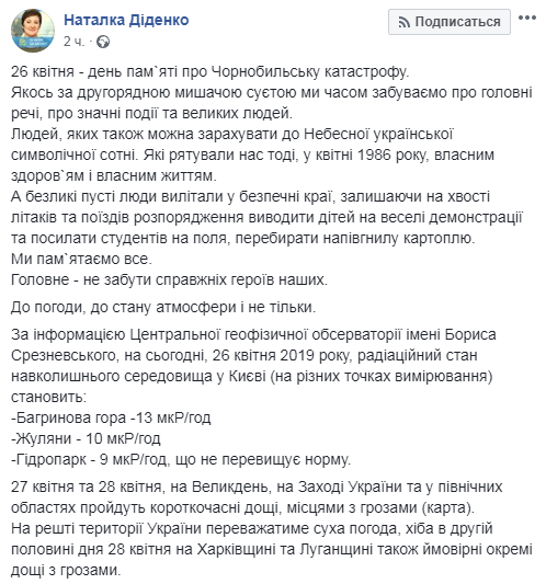 "По информации Центральной геофизической обсерватории имени Бориса Срезневского, сегодня, 26 апреля 2019, радиационное состояние окружающей среды в Киеве (на разных точках измерения) составляет: Багринова гора -13 мкР/ ч, Жуляны - 10 мкР/ч, Гидропарк - 9 мкР/ч, что не превышает норму", - написала Диденко.