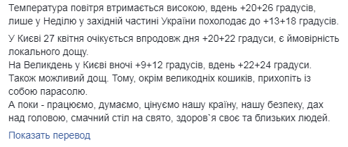"На Пасху в Киеве ночью +9...+12 градусов, днем ​​+22...+24 градуса. Также возможен дождь. Поэтому, кроме пасхальных корзин, прихватите с собой зонт. А пока - работаем, думаем, ценим нашу страну, нашу безопасность, крышу над головой, вкусный стол на праздник, здоровья свое и близких людей", - подытожила Диденко.