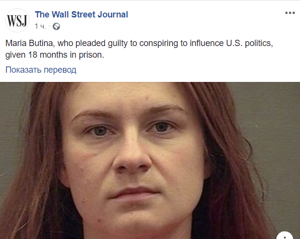 Суд в США вынес приговор россиянке Марии Бутиной, которая должна будет провести 18 месяцев в тюрьме за деятельность в интересах РФ в Америке. Об этом сообщает The Wall Street Journal в Facebook.