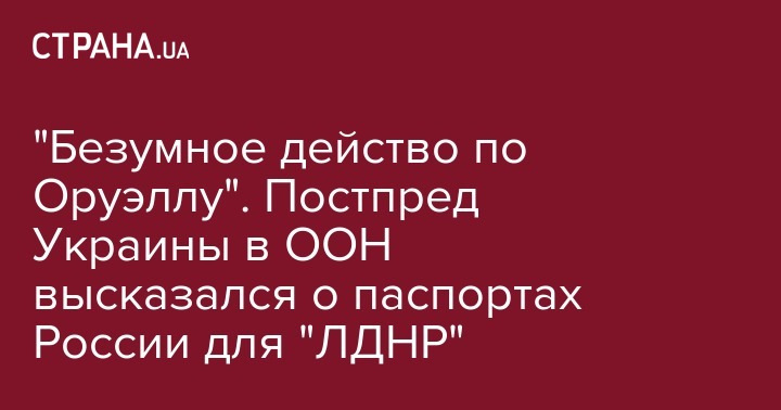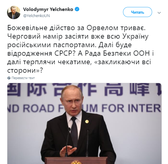 Желание президента России Владимира Путина выдать гражданам Украины российские паспорта похоже на произведение британского писателя Джорджа Оруэлла. Об этом в Twitter написал Постоянный представитель Украины в ООН Владимир Ельченко.