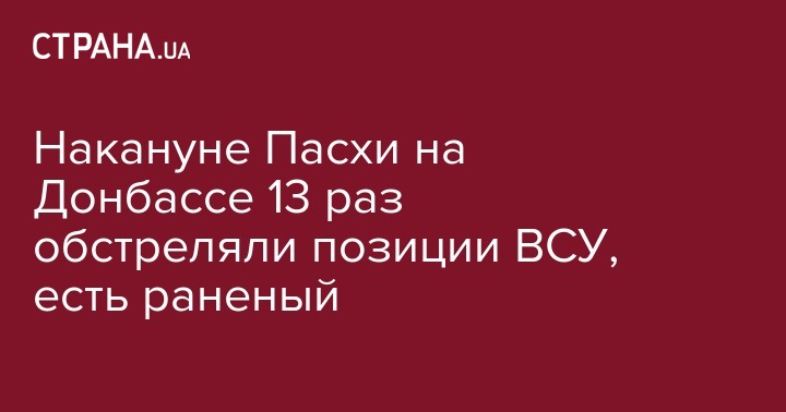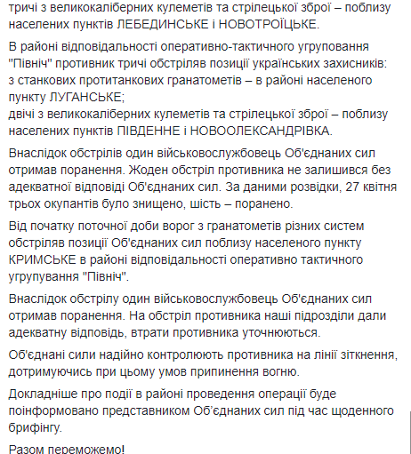"27 апреля вооруженные формирования Российской Федерации 13 раз нарушили режим прекращения огня, из них один раз - с применением запрещенных Минскими соглашениями минометов калибра 82 мм. Вследствие обстрелов один военнослужащий Объединенных сил получил ранения", - сказано в сообщении.