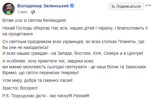"Пусть Господь хранит нас всех, наших детей и Украины, и благословит ее на процветание. Со светлым праздником всех украинцев, во всех уголка планеты, где бы они не находились! И всех наших людей - на Западе, Востоке, Юге, Севере и в Центре!", - написал он на русском языке. Вся остальная часть текста написана на украинском.
