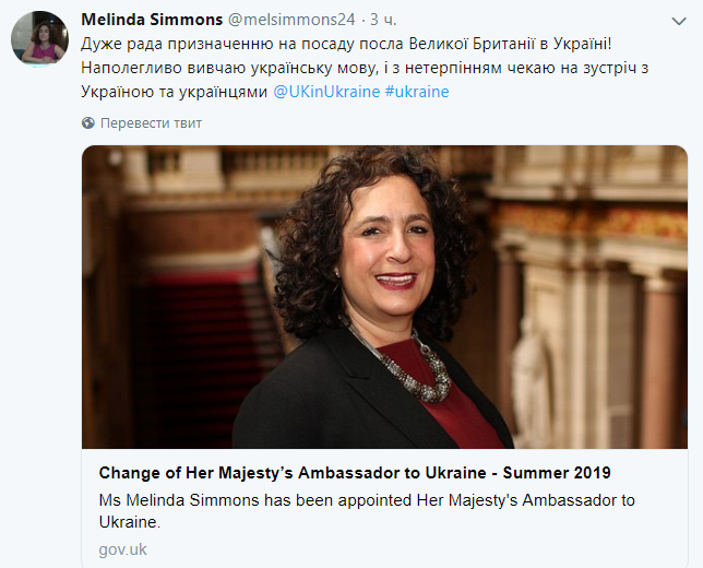 В своем микроблоге в Twitter Симмонс указала: "Очень рада назначению на должность посла Великобритании в Украине! Настойчиво изучаю украинский язык и с нетерпением жду встречи с Украиной и украинцами" (сообщение написано на украинском языке).