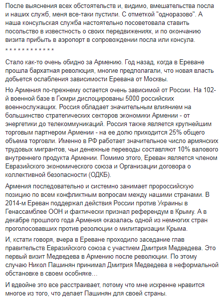 "Я другой такой страны не знаю", - подумал я, и, как позже выяснилось, был прав: в Армении такое уже случалось с нашими гражданами. Запреты выставляются по требованию Российской Федерации в рамках синхронизации базы погранслужбы Армении с санкционным списком РФ", - написал нардеп.