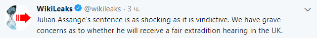 "Приговор Джулиану Ассанжу шокирует и демонстрирует стремление отомстить. У нас есть серьезные опасения по поводу того, будет ли справедливым рассмотрение в Великобритании вопроса о его экстрадиции ", - говорится в сообщении организации.