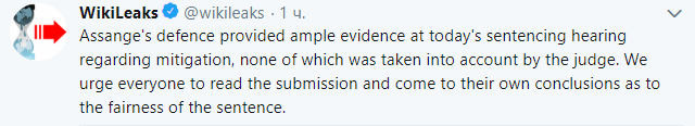 В Wikileaks назвали шокирующим и несправедливым приговор к 50 неделям тюрьмы, который лондонский суд вынес основателю Wikileaks Джулиану Ассанжу. Об этом отмечается в сообщении, опубликованном в Twitter Wikileaks.