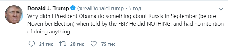 "Почему президент Обама ничего не предпринял в отношении России, когда в сентябре (2016 года - Прим. Ред.) был проинформирован ФБР - до ноябрьских выборов? Он ничего не предпринял, да и не собирался предпринимать", - написал он в Twitter в среду.