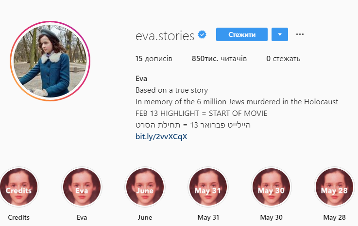 1 мая в инстаграме запустился аккаунт Eva.Stories, посвященный еврейской девочке из Венгрии Еве Хейман, которая погибла в 1944 году в Освенциме. На момент смерти ей было 13 лет. Сохранился дневник, который вела девочка. После войны тетрадь нашла ее мама и теперь на основе записей Евы будут создаваться посты на странице в соцсети.