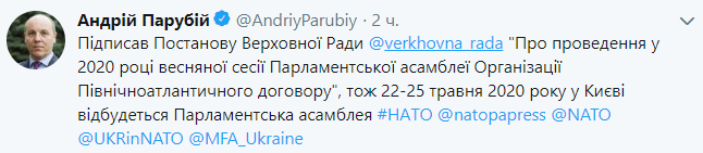 У Андрея Парубия, который на момент трагедии был секретарем СНБО, сегодня в Facebook записей нет. А в Твиттере говорится о том, что спикер подписал постановление о проведении весенней сессии НАТО в Киеве.