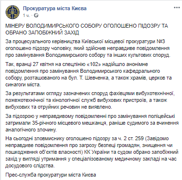 Уточняется, что 27 апреля поступило анонимное сообщение о заминировании Владимирского кафедрального собора, расположенного на бульваре Тараса Шевченко, а также храмов, церквей и синагоги города. При обследовании этих объектов взрывоопасных предметов не нашли, а вскоре правоохранители задержали подозреваемого, который ранее уже был судим за аналогичное преступление.