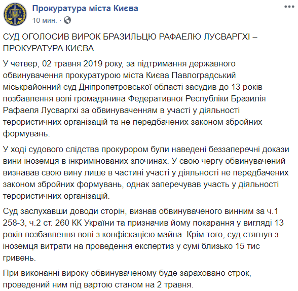 Бразилец Рафаэль Лусварги, который воевал за сепаратистов на Востоке Украины, получил 13 лет заключения.