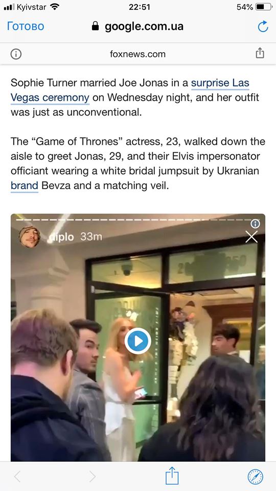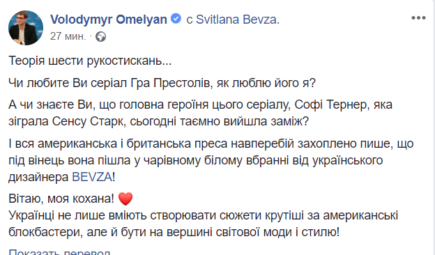 "А знаете ли вы, что главная героиня этого сериала, Софи Тернер, сыгравшая Сансу Старк, сегодня тайно вышла замуж? И вся американская и британская пресса наперебой восторженно пишет, что под венец она пошла в волшебном белом наряде от украинского дизайнера BEVZA!", - написал он.
