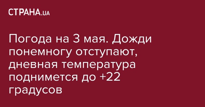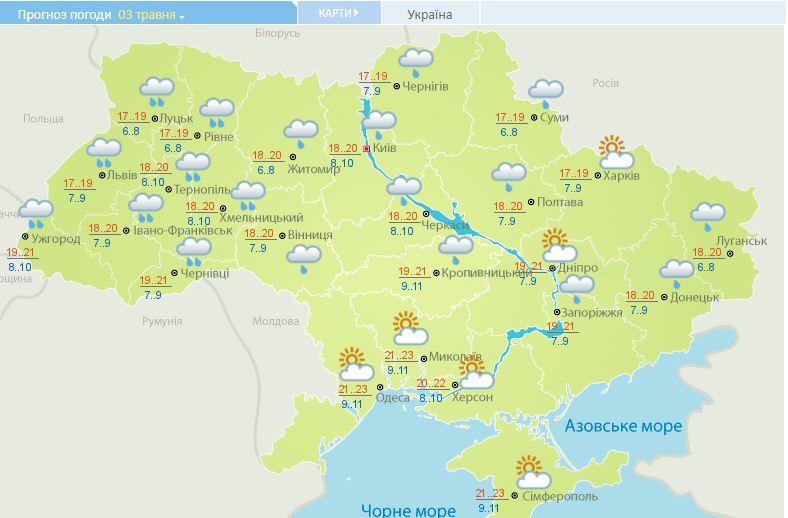Сегодня, 3 мая, синоптики обещают Украине дневные дожди почти по всей территории Украины, осадки обойдут Харьковскую, Полтавскую, Днепропетровскую области, а также юг страны. При этом температура воздуха постепенно повышается, сообщает сайт Укргидрометцентра.