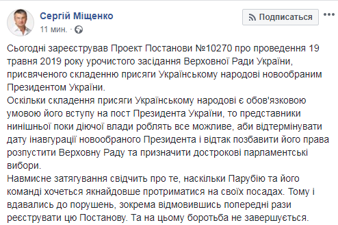 Внефракционный народный депутат Украины Сергей Мищенко, зарегистрировавший постановление о назначении даты присяги новоизбранного президента Украины на 19 мая, рассказал о чинимых спикером "Парубием и его командой" препятствиях.