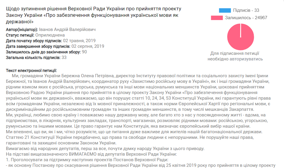 Петиция была опубликована на веб-сайте украинского парламента 2 мая. За сутки она собрала 33 подписи. На сбор подписей есть еще 90 дней.