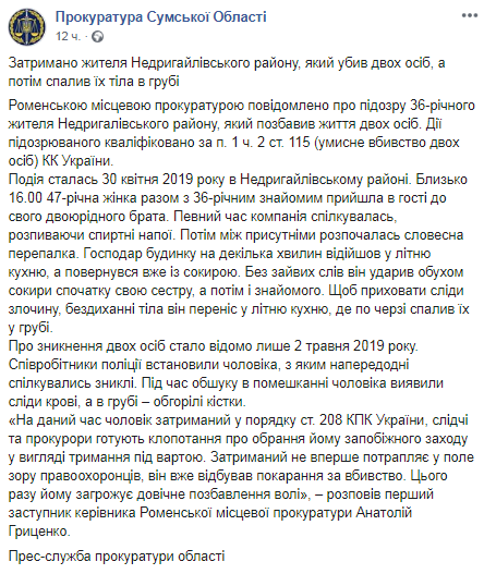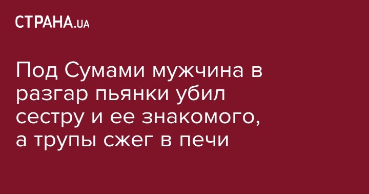Во вторник, 30 апреля, в Недригайловском районе Сумской области мужчина убил свою сестру и ее знакомого и сжег их трупы в печи. Об этом сообщает пресс-служба прокуратуры Сумской области в Facebook.