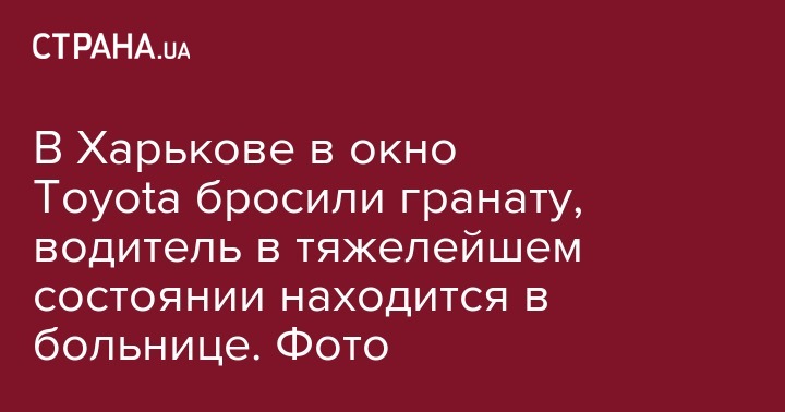 В Харькове в окно автомобиля, в котором находился водитель, бросили гранату, водитель в крайне тяжелом состоянии попал в больницу. Об этом сообщили в отделе коммуникации ГУ НП Украины в Харьковской области.