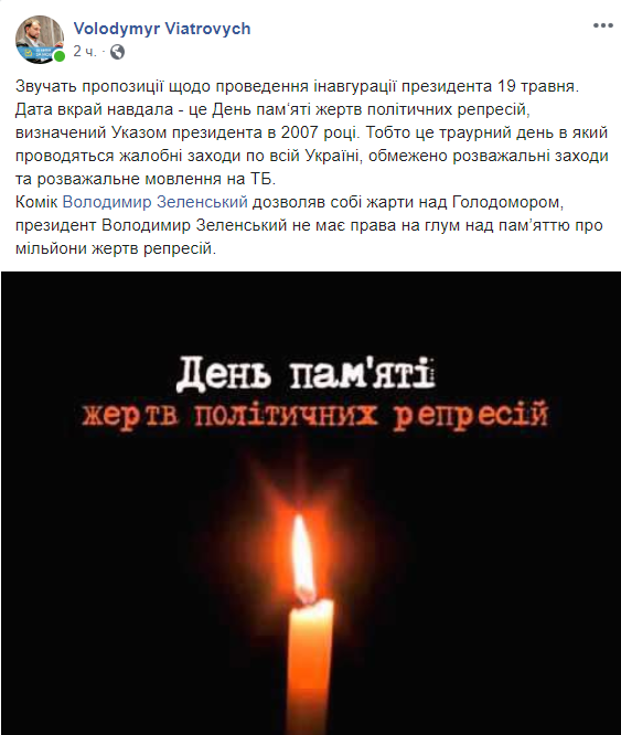 "Звучат предложения о проведении инаугурации президента 19 мая. Дата крайне неудачная - это День памяти жертв политических репрессий, определенный Указом Президента в 2007 году. То есть это траурный день в который проводятся траурные мероприятия по всей Украине, ограничено развлекательные мероприятия и развлекательное вещание на ТВ", считает Вятрович.