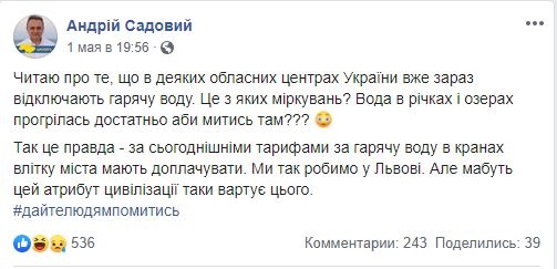 "Читаю о том, что в некоторых областных центрах Украины уже сейчас отключают горячую воду. Это из каких соображений? Вода в реках и озерах прогрелась достаточно, чтобы мыться там? Да, это правда – по сегодняшним тарифам за горячую воду в кранах летом города должны доплачивать. Мы так делаем во Львове. Но, видимо, этот атрибут цивилизации таки стоит этого", - написал 1 мая Андрей Садовой.