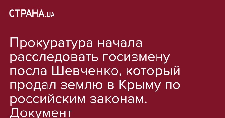 По его словам, расследование ведется по статье 111 УК Украины, предусматривающей государственную измену. Портнов отметил, что Шевченко продал в Крыму свою землю по российским законам на российском нотариальном бланке, за российские рубли, в российском кадастре и платежами в российский бюджет. В договоре Шевченко указал адрес своей земли - Российская Федерация, Республика Крым.