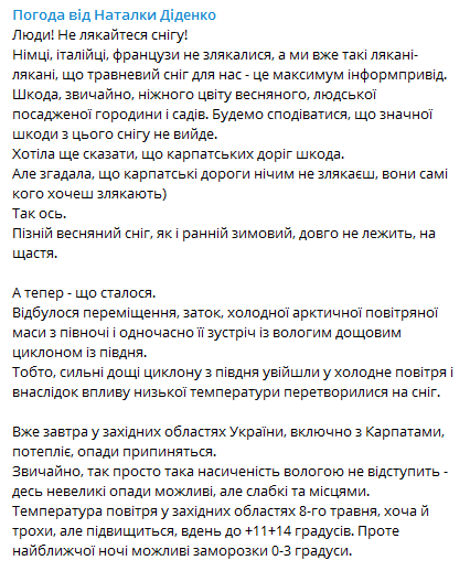 В среду, 8 мая, в Украине потеплеет, снег, который сегодня выпал на Прикарпатье, скоро растает. Об этом написала синоптик Наталья Диденко в своем Тelegram-канале.