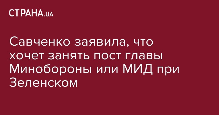 Савченко заявила, что хочет занять пост главы Минобороны или МИД при Зеленском