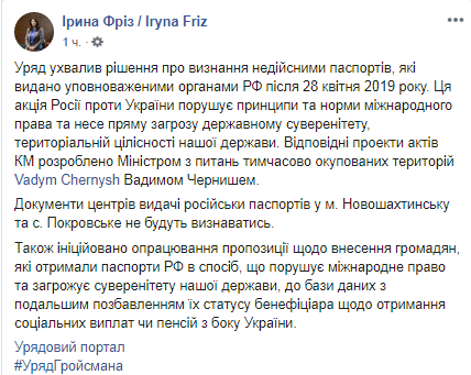 "...Инициирована обработка предложения о внесении граждан, получивших паспорта РФ способом, который нарушает международное право и угрожает суверенитету нашего государства, в базу данных с последующим лишением их статуса бенефициара на получение социальных выплат или пенсий со стороны Украины", - написала Фриз.