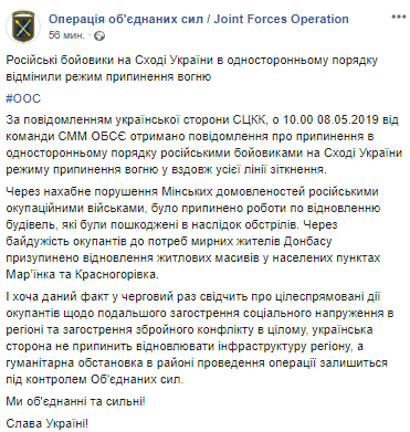 "По сообщению украинской стороны СЦКК, в 10:00 08.05.2019 от команды СММ ОБСЕ получено сообщение о прекращении в одностороннем порядке российскими боевиками на востоке Украины режима прекращения огня в вдоль всей линии соприкосновения", - говорится в сообщении.