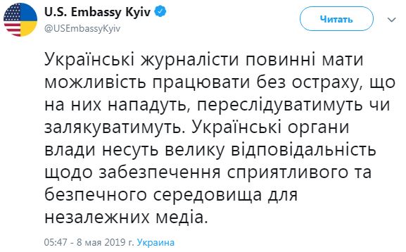 "Украинские органы власти несут большую ответственность по обеспечению благоприятной и безопасной среды для независимых СМИ", - сказано в сообщении американского посольства.