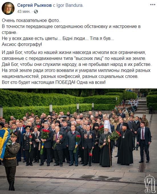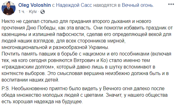 "Никто не сделал столько для придания второго дыхания и нового прочтения Дню Победы, как эта власть. Они помогли избавить праздник от казенщины и излишней пафосности, сделав его определяющей вехой для людей наших взглядов, для всех сторонников мирной, многонациональной и разнообразной Украины.