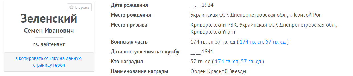 11:27 "Страна" нашла наградные документы дедушки Владимира Зеленского - Семена Ивановича. Его данные есть в базе "Память народа".