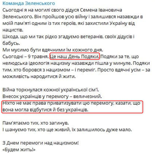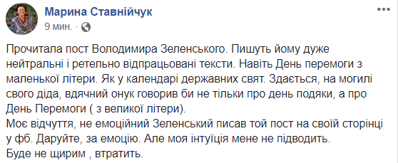 "Прочитала пост Владимира Зеленского. Пишут ему очень нейтральные и тщательно отработанные тексты. Даже День победы с маленькой буквы. Как в календаре государственных праздников. Кажется, на могиле своего деда, благодарен внук говорил бы не только о дне благодарности, а о Дне Победы (с большой буквы).
