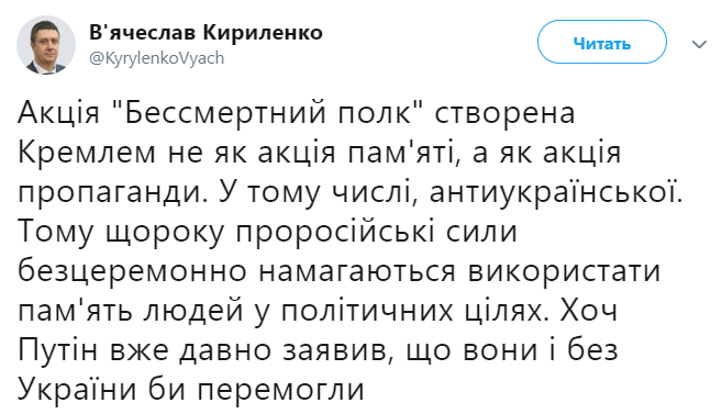 "Акция "Бессмертный полк" создана Кремлем не как акция памяти, а как акция пропаганды. В том числе, антиукраинской. Поэтому ежегодно пророссийские силы бесцеремонно пытаются использовать память людей в политических целях. Хотя Путин уже давно заявил, что они и без Украины бы победили".