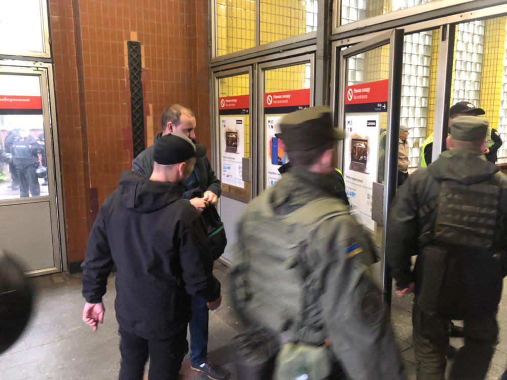 9:22 У выхода из метро "Арсенальная" кордоны полиции. Всех подозрительных обыскивают. За станцией метро тоже с пару десятков "космонавтов" - полицейских при полной амуниции и в защитных шлемах.