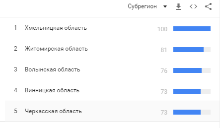 10:42 По запросу "День перемоги" в украинском Google сейчас лидирует Хмельницкая область. Далее идут Житомир, Волынь, Винница и Черкассы.
