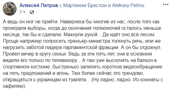9:56 Порохоботы начали комментировать визит Порошенко на Аллею славы сегодня. Главная идея - что президент молодец, раз пришел. А ведь мог бы и не прийти, ведь он уже не обязан это делать.