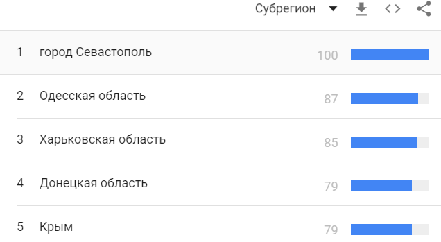 Русскоязычный запрос наиболее популярен в Крыму, Одессе, Харькове и Донбассе.