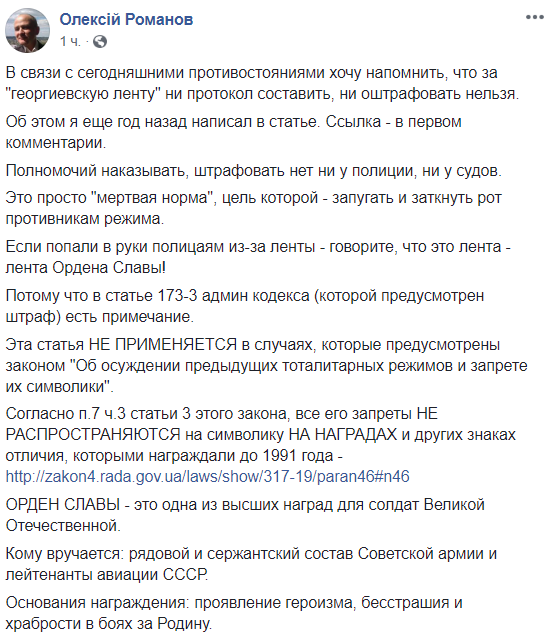 "В связи с сегодняшними противостояниями хочу напомнить, что за "георгиевскую ленту" ни протокол составить, ни оштрафовать нельзя.