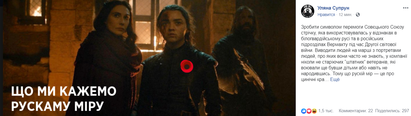 10:13 Ульяна Супрун опубликовала пост, в котором никого ни с чем не поздравила, зато обрушилась на "русский мир", опубликовав фото Арьи Старк.