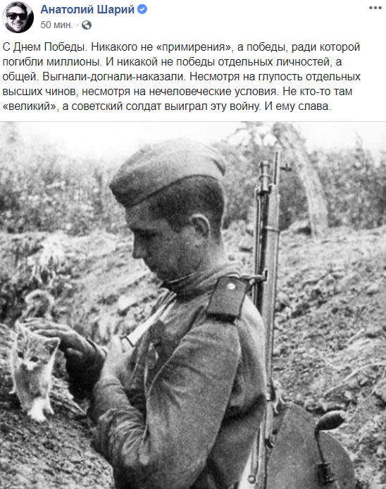 10:21 "С Днем Победы. Никакого не "примирения", а победы, ради которой погибли миллионы. И никакой не победы отдельных личностей, а общей. Выгнали-догнали-наказали. Несмотря на глупость отдельных высших чинов, несмотря на нечеловеческие условия. Не кто-то там "великий", а советский солдат выиграл эту войну. И ему слава", - блогер Анатолий Шарий.