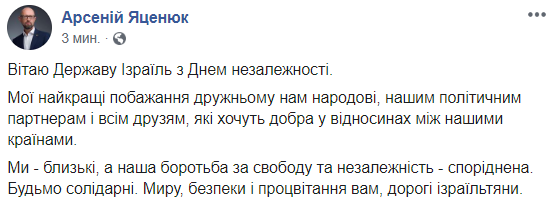 11:57 Арсений Яценюк в Facebook ни слова не сказал о Дне победы, зато поздравил Израиль с днем независимости.