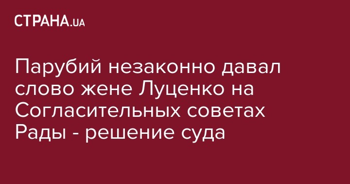 Окружной административный суд Киева признал противоправными действия спикера Верховной Рады Андрея Парубия по предоставлению представителю президента Ирине Луценко (нардеп от БПП и жена главы ГПУ Юрия Луценко) слова для выступления на заседаниях Согласительного совета депутатских фракций и групп в период с 5 февраля 2018г по 8 апреля 2019 г. Об этом сообщается на сайте Окружного админсуда Киева