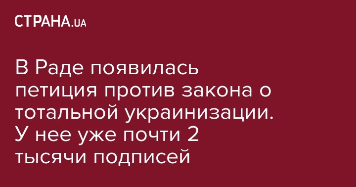 На сайте Верховной Рады петиция "О приостановлении решения Верховной Рады Украины о принятии проекта Закона Украины "Об обеспечении функционирования украинского языка как государственного", набрала уже 1810 голосов.